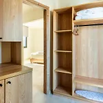 Bathroom facilities also include a walk-in shower and a separate toilet. There are hair dryers and towels for guests' comfort.